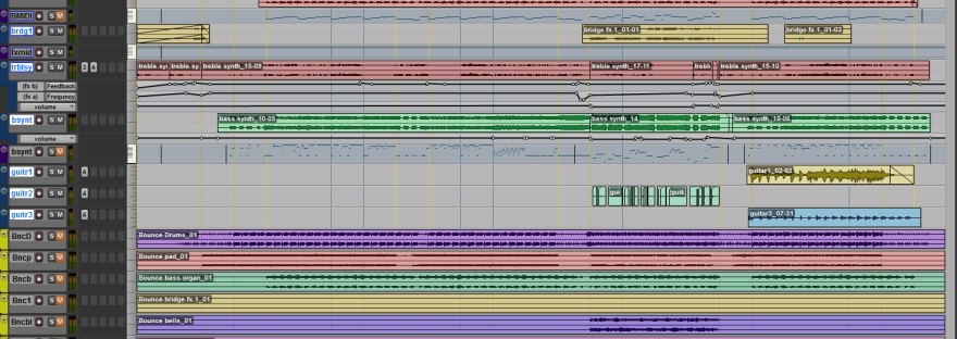 First, figure out how many tracks you have to bounce and create that many new stereo audio tracks. You only need holder tracks for things that produce sound in your final mix — for instance, MIDI tracks themselves won’t count, but any instrument tracks that they’re attached to do count. For Adoré, there were ten distinct sound-making tracks, so I created ten new stereo audio tracks. For my own sanity’s sake, I color coded them bright yellow to distinguish them from the rest of the song and labeled all of them “Bounce [Trackname]” based on what source track they were going to hold.