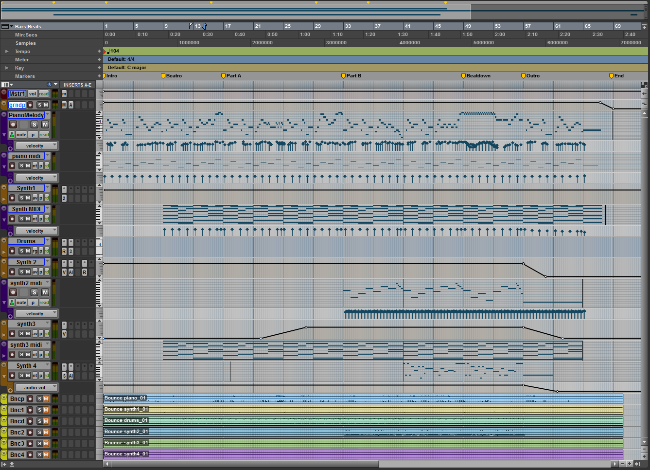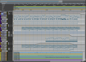 Here we have Adoré from halt, a somewhat complex song with several programmed synthesizer parts, a few live synthesizer parts, programmed drums, live guitars, and all kinds of effects with a good bit of automation of various parameters throughout the piece. Along the bottom of the window you can see a set of ten yellow-colored tracks with audio data that spans the whole length of the track. This is the bounced audio from each of the tracks above, with all the effects, automation, panning, volume, and edits applied and pushed into a single contiguous piece of audio for each track.