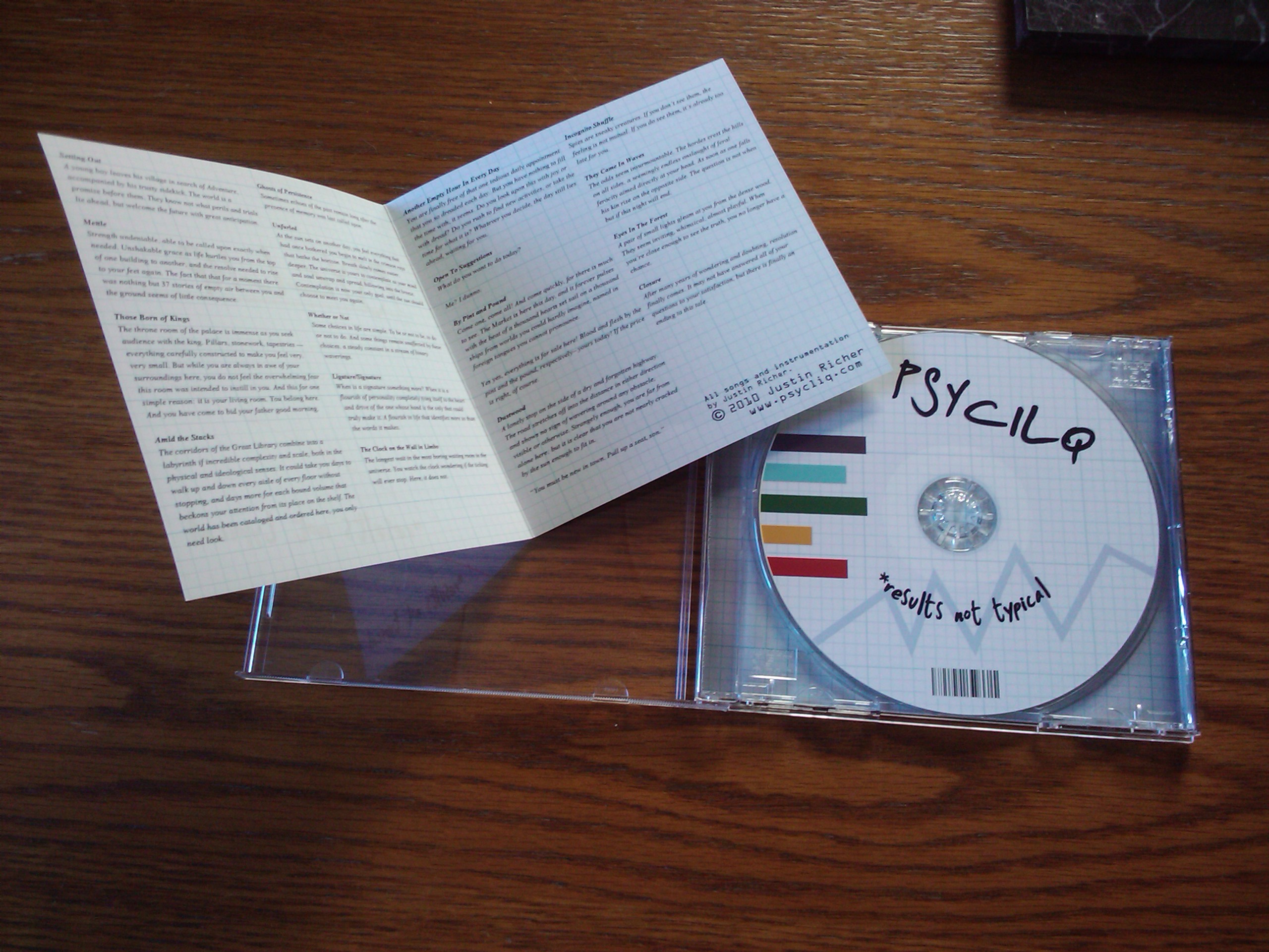 One of the biggest problems in being a smalltime independent artist is the upfront cost of the production of physical media. This is especially a pain to me because I really like physical media, and I really want to make it available to people who also like it. For both The Mathemagician’s Riddle and halt, I did absolutely everything from my home. I burned the CDs, printed the labels using lightscribe, printed the insert cards, packaged them all up into cases, and sent them off to CDBaby for sale. For Results Not Typical, I tried something a bit different: instead of printing my own cards, I got a small batch printed by a poster/cd printing place. I still printed the CDs on my own and packaged it all up by myself, but I was overall pretty happy with the quality.